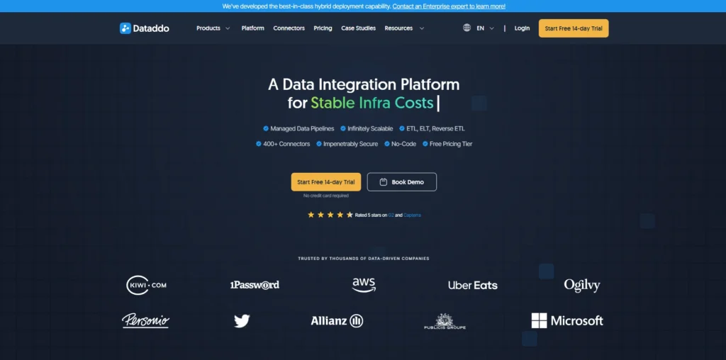 | Dataddo | From $99/month | 14-day trial | No-code ETL/CDC, multi-source | Yes |
