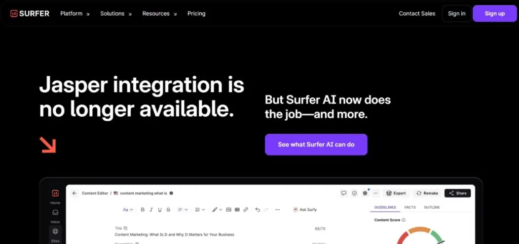 Surfer SEO is a robust platform that allows planning, writing, and optimisation of the content in a single environment. It is constructed based on actual SERP data; thus, all that it proposes is what is actually performing well today. With keyword discovery, content scoring/auditing of old pages, Surfer provides you with a clear way to go, all the way to a published and optimised page. It is particularly awesome in terms of writers and marketers who desire SEO guidance in their workflow.